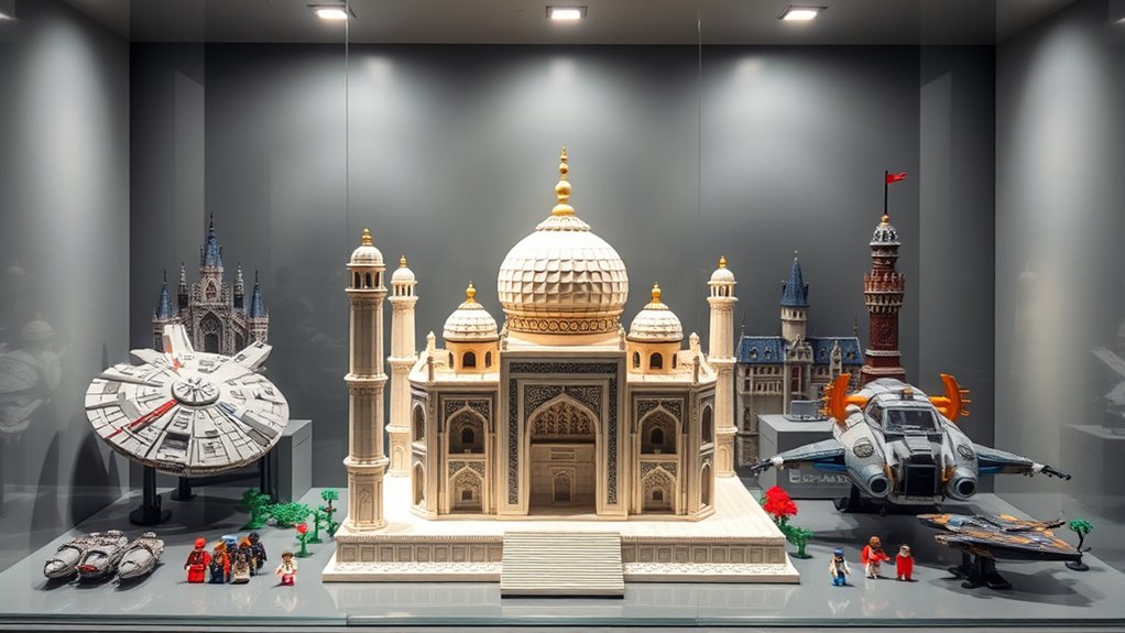 If you’re looking to elevate your LEGO collection, I recommend exploring some of the best premium sets like the detailed Millennium Falcon, Hogwarts Castle, and iconic landmarks like the Statue of Liberty. High-quality models such as the Darth Vader Helmet and Jaws Diorama add both display value and craftsmanship. These sets are perfect for passionate collectors seeking intricate builds and cultural significance. Keep exploring—they’ll reveal even more about these stunning options for your collection.