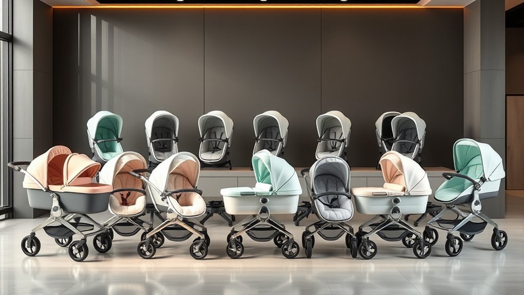 Stroller bundles are designed to grow with your child by offering adjustable seats and multiple configurations. I love how they easily shift from newborn recline to upright toddler modes, accommodating my child’s changing needs. Many bundles include removable, extendable canopies and extra padding for comfort. Plus, they often have multi-position reclines and harness systems, making it simple to keep my little one secure and comfortable as they grow.