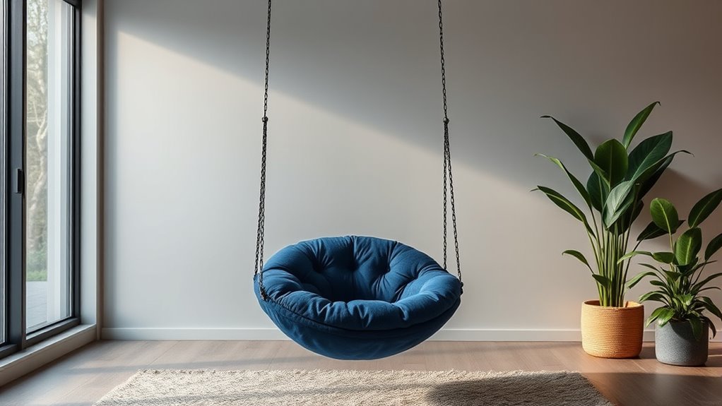 When selecting a premium sensory swing for indoor use, I make sure it meets safety standards like ASTM F963 for toy safety and EN71 for European compliance. I look for sturdy, durable materials, secure hardware, and proper weight ratings. Ensuring proper installation is key, so I follow manufacturer guidelines carefully. Regular inspections for wear and tear help keep the swing safe, giving me peace of mind while enjoying its calming benefits.