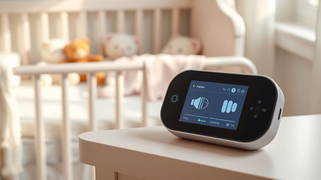Installing a smart baby monitor with breath tracking can seem intimidating, but it becomes much easier when I select a model with clear setup instructions and simple mounting options. I look for devices that come with step-by-step guides and video tutorials, making the process straightforward. Versatile mounting options, like wall mounts or stands, help me place the monitor at the right height and angle without hassle. I also choose models with quick, easy Wi-Fi or Bluetooth pairing, so I don’t spend ages troubleshooting connection issues. User-friendly interfaces, whether through intuitive apps or physical buttons, make adjustments simple during installation. Overall, a monitor designed with ease of setup in mind saves me time and frustration, helping me focus on what truly matters—my baby’s safety.
