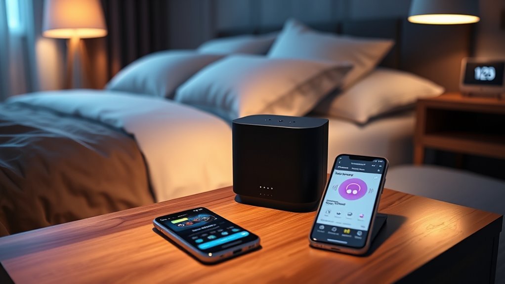If you’re searching for the 15 best smart sound machines with app control and premium features in 2025, I’ve got detailed options that blend extensive sound libraries, customizable lighting, remote operation, and portable designs. Many models support white noise, nature sounds, sleep routines, and elegant ambient lighting, all controllable via intuitive apps. These devices are perfect for creating a personalized sleep or relaxation environment. Keep going to discover the top options that suit your needs perfectly.