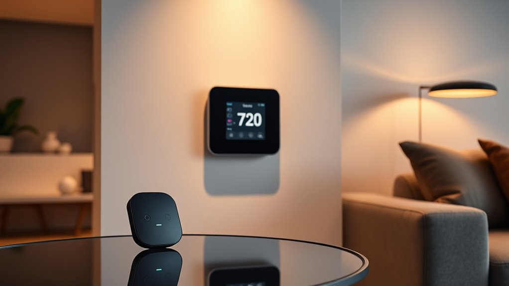 The spectrum of remote detectors in smart thermostats generally extends up to 200 feet indoors, but this distance can vary considerably based on your home’s construction and obstacles. Thick walls, metal studs, and electronic interference can weaken signals, making it harder for sensors to communicate effectively. Proper placement within this range is essential to guarantee accurate occupancy detection and temperature readings, which directly impact your comfort. In larger or multi-story homes, extending sensor range might require Wi-Fi repeaters or mesh networks to maintain connectivity across all areas. Regularly testing sensor connections helps prevent false occupancy or inaccurate temperature readings caused by communication issues. Being aware of these factors ensures your remote sensors function reliably, giving you consistent control over your home’s climate.