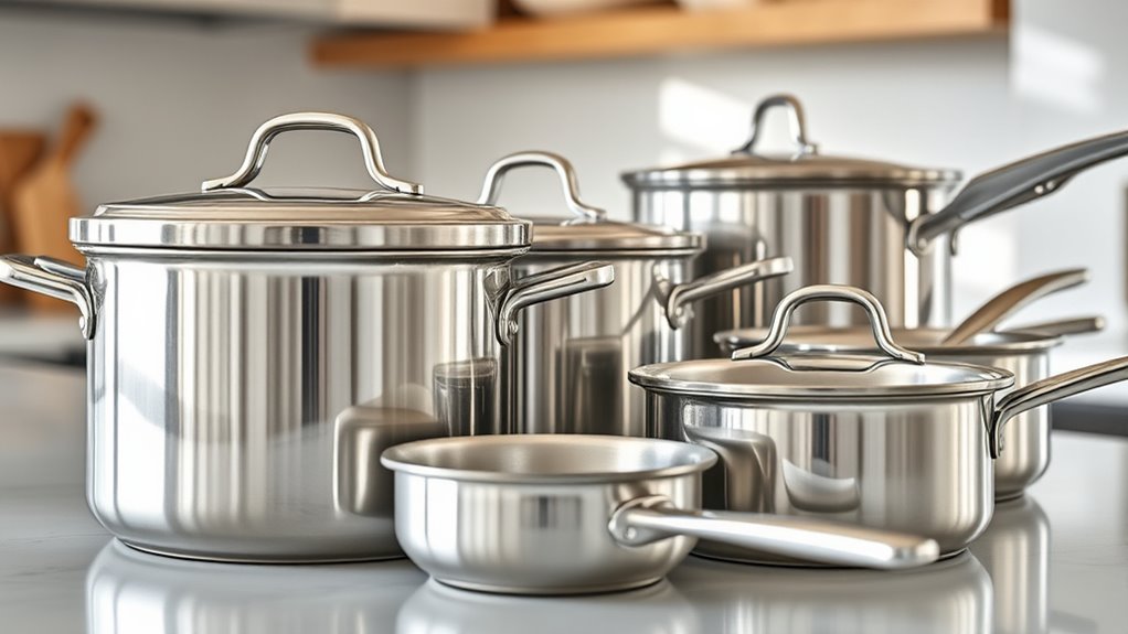 Maintaining the shine and longevity of your stainless steel cookware requires careful attention to cleaning and care routines. While dishwasher safe, handwashing with mild detergents and a soft sponge helps preserve its luster and prevents discoloration. For stubborn stains or water spots, using baking soda, vinegar, or specialized cleaners like Bar Keepers Friend works effectively. To keep food from sticking and make cleaning easier, preheat your cookware and use enough oil or fat during cooking. Always let your pots cool before washing to avoid warping and simplify cleanup, especially after high-heat cooking. Regular maintenance, including polishing and proper storage, extends the lifespan and keeps your cookware looking new. Consistent care guarantees your investment remains durable and stylish over time.