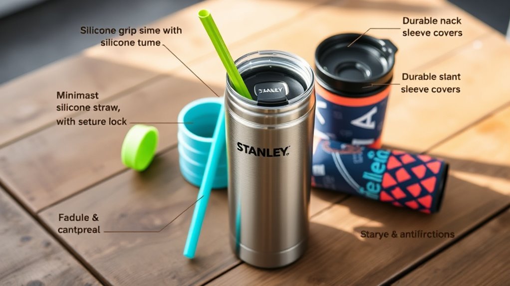 If you want to upgrade your Stanley tumbler, I suggest exploring accessories like durable straw replacements, stylish covers, and customizable charms. These add convenience, style, and protection for your hydration goals. From spill-resistant lids to eco-friendly materials, the options are endless. Keep your drink cold longer and your tumbler protected from scratches. If you stick around, you’ll discover the best accessories to make your tumbler even more functional and fun.