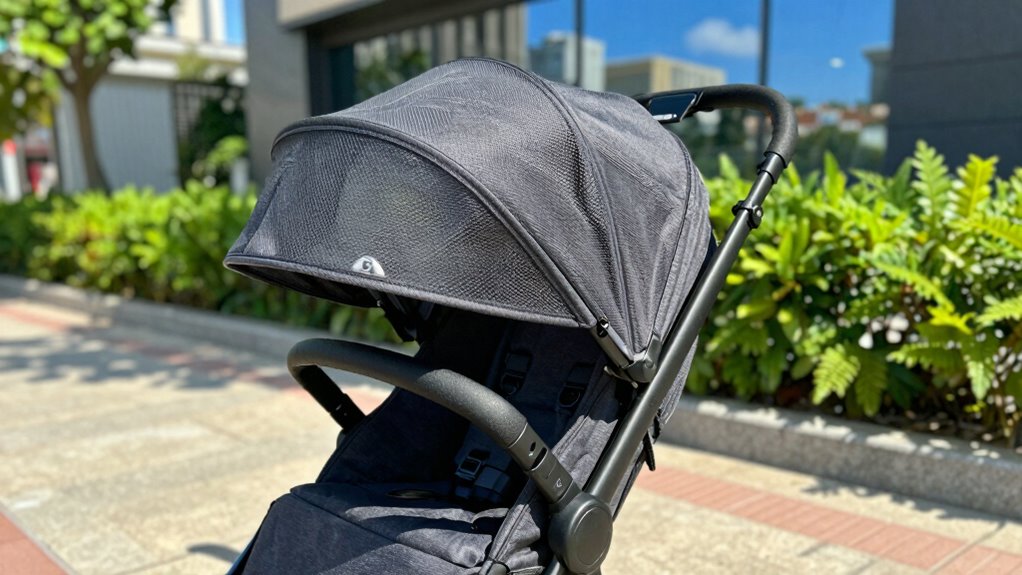 Weather-resistant components play a crucial role in keeping your little one comfortable during hot and humid days. Waterproof fabrics and sealed zippers protect against rain and humidity, guaranteeing the stroller stays dry and comfortable. Durable, UV-resistant canopies shield your child from harsh sunlight and prevent sun damage, making outdoor outings safer and more enjoyable. Stroller frames made of rust-proof materials like aluminum or treated steel resist corrosion, which is necessary in humid climates. Ventilated materials and mesh panels improve airflow, reducing heat buildup inside the stroller. Additionally, weather-resistant accessories like rain covers and sun shields help create a controlled environment regardless of weather conditions. These features work together to ensure your child stays cool, dry, and comfortable during any hot weather adventure.