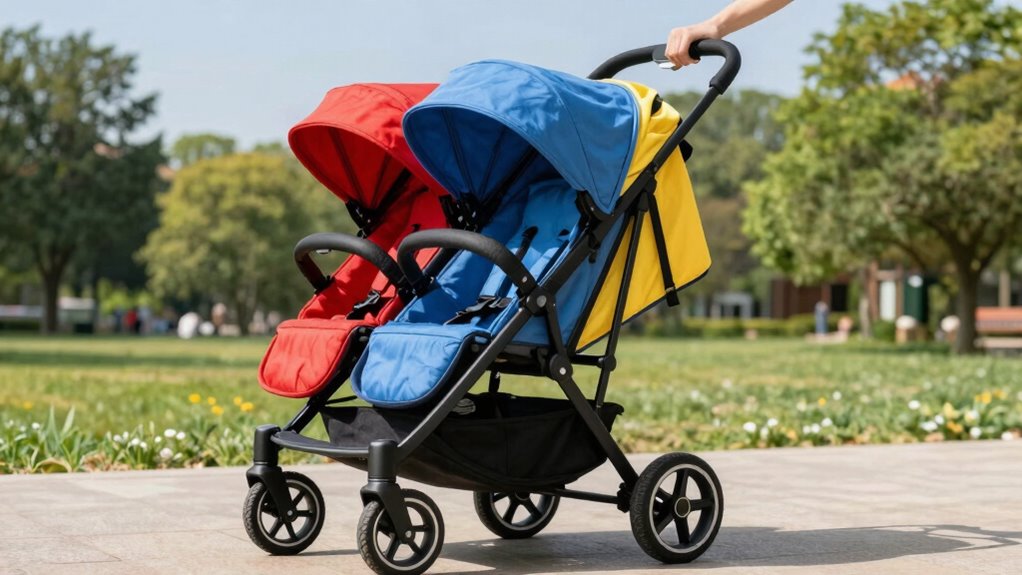 Have you considered how seating flexibility can make or break your experience with a stroller wagon for three kids? It’s vital to choose one with removable or adjustable seats, so you can easily adapt to different ages and needs. Multiple seating configurations, like face-to-face or side-by-side, give you versatility for various outdoor activities and preferences. Safety features such as 5-point harnesses and secure straps are essential to keep everyone safe during travel. Also, check if the seats are spacious and cushioned enough to guarantee comfort for children of different sizes and ages. Finally, evaluate how simple it is to add, remove, or convert seats into a cargo space when needed. Flexibility in seating options truly enhances convenience and usability for busy parents like us.