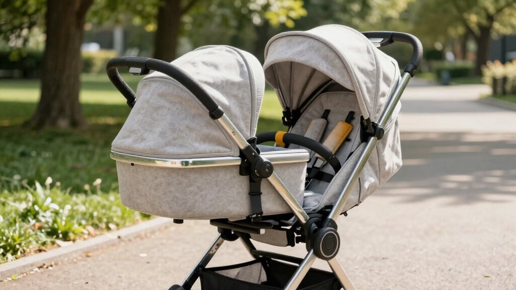 Choosing a stroller with both a bassinet and a toddler seat means considering how well it can grow with your child. I look for a frame and seats that are compatible with both attachments, so switching is seamless as my kid develops. Adjustable or reversible seats are essential, allowing the seat to face either parent or forward, adapting to different stages. I also check if the bassinet and toddler seat share the same mounting system or connectors, making progression quick and tool-free. A modular design is a big plus, as it allows easy removal and attachment of different seating options. Finally, I ensure the weight limits suit my child’s current size and future growth, to safety and long-term usability.