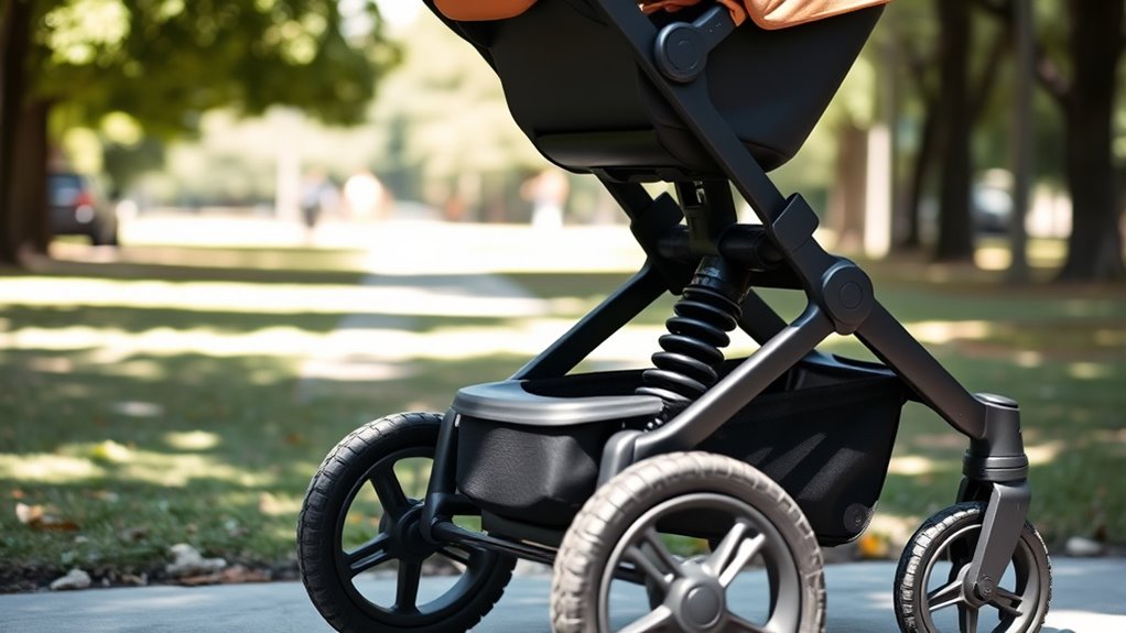 An adjustable suspension mechanism that’s easy to operate makes a big difference during walks, especially when terrain changes unexpectedly. I look for systems that let me modify suspension settings quickly and without tools, so I can adapt on the fly. Simple controls like dial knobs or lever switches are ideal—they make tuning seamless while I’m on the move. Some strollers even feature one-handed adjustment, which is a game-changer for multitasking. I also appreciate clear indicators or feedback that confirm the current suspension setting, giving me confidence that everything’s secure. Reliability matters too; a good adjustment mechanism should hold its settings over time and use, preventing accidental changes that could affect ride quality or safety. Overall, a straightforward, responsive system makes a real difference.