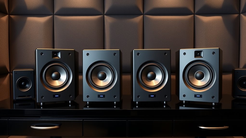 Selecting the right studio monitor speakers depends heavily on your room size, as it influences how sound behaves and how effectively the monitors perform. Larger rooms need monitors with higher wattage and bigger drivers, like 6.5-inch or 8-inch woofers, to fill the space with accurate sound without distortion. Smaller rooms benefit from near-field monitors with 3.5-inch to 5-inch drivers, which help minimize sound reflections and prevent bass muddiness. Acoustic treatment, such as panels and diffusers, also plays a role in shaping sound clarity and frequency response, regardless of size. Additionally, consider the monitor’s dispersion pattern and frequency response to guarantee even coverage and avoid dead spots. Proper placement is vital, especially in larger rooms, to maximize sound accuracy and imaging.