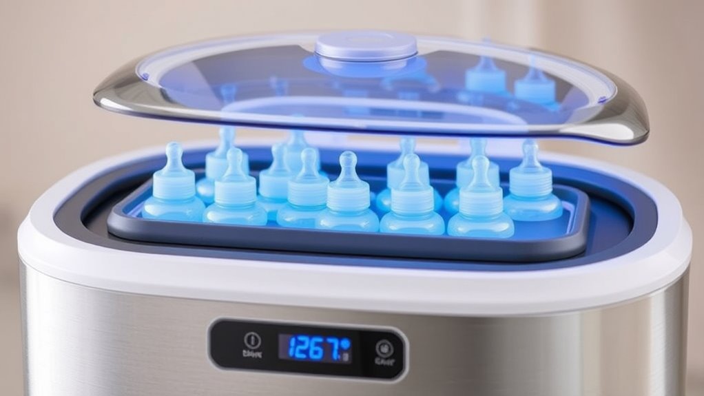 Yes, UV sterilizers are quite effective at reducing bacteria and viruses, but no method is flawless. They use ultraviolet light to damage the DNA of microbes, making them harmless. I trust them for daily sanitization, but I also follow additional cleaning steps to guarantee my baby’s bottles are as safe as possible. Combining methods gives me peace of mind, knowing I’m doing everything I can to protect my little one.