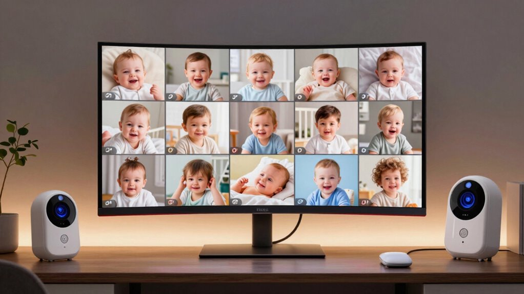 Yes, split-screen monitors can automatically detect and switch between cameras. They’re designed to make monitoring easier by seamlessly shifting focus from one camera to another when movement is detected or when a baby wakes up. This automation helps me keep an eye on multiple rooms without manually changing screens. It’s like having a vigilant, intelligent assistant that guarantees I never miss a precious moment or important activity.