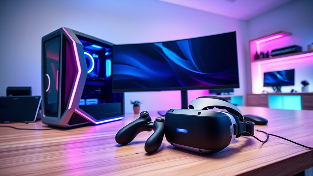 For prolonged VR gaming, I recommend a high-quality cooling system, like liquid cooling or multiple case fans, to prevent overheating. VR headsets and powerful PCs generate a lot of heat during extended sessions, so maintaining ideal temps is vital for performance and comfort. I always make sure my PC has good airflow and monitor temps regularly, especially during long gaming marathons, to keep everything running smoothly and avoid thermal throttling.