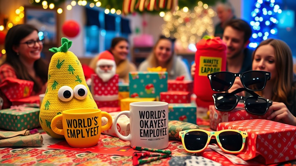 I’ve found that trending novelty gifts like quirky coffee mugs, funny socks, or desktop games are always a hit and stay within budget. I love checking out online shops for unique items like inflatable drink holders or humorous kitchen gadgets. These gifts are fun, unexpected, and perfect for a White Elephant exchange. Keep an eye on social media trends, and you’ll discover fresh, popular ideas that everyone will enjoy!
