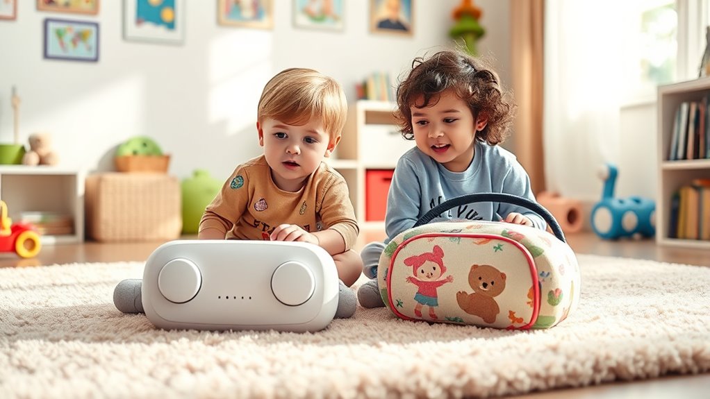 Parental control options are essential features to contemplate because they directly impact how much oversight parents have over their child’s listening experience. I’ve found that Yoto devices typically include app-based controls allowing parents to manage content, set time limits, and review listening history, giving a sense of security. Toniebox mainly offers controls through its app, letting parents choose which Tonies can be played and monitor usage. Some devices also feature timers or sleep modes, helping regulate screen-free listening and bedtime routines. The level of customization and safety features in these controls can profoundly influence a parent’s confidence in allowing independent play. Ultimately, choosing a device with robust parental controls ensures a safer, more manageable listening environment for kids.